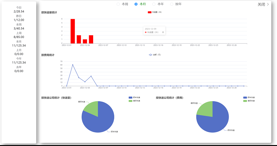 按时间统计 按件数和费用统计 按不同的承运快递公司统计